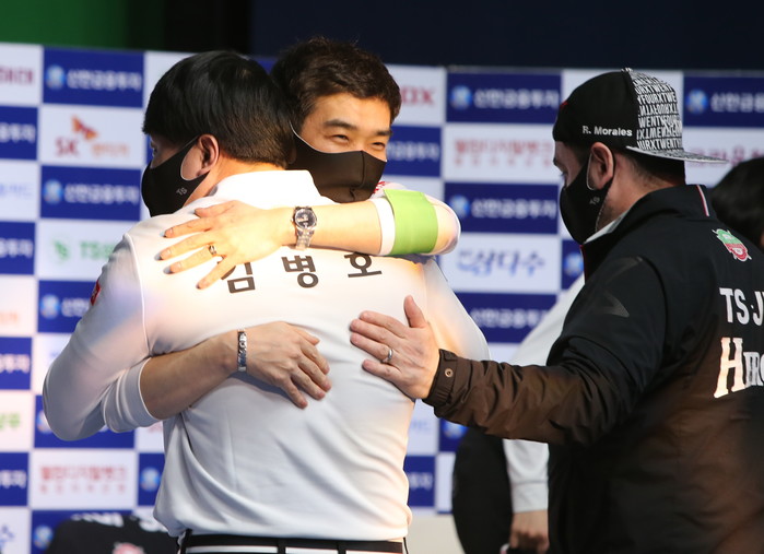 ▲ 6세트에서 동점을 만들어준 맏형 김병호를 안고 기뻐하는 정경섭주장 |