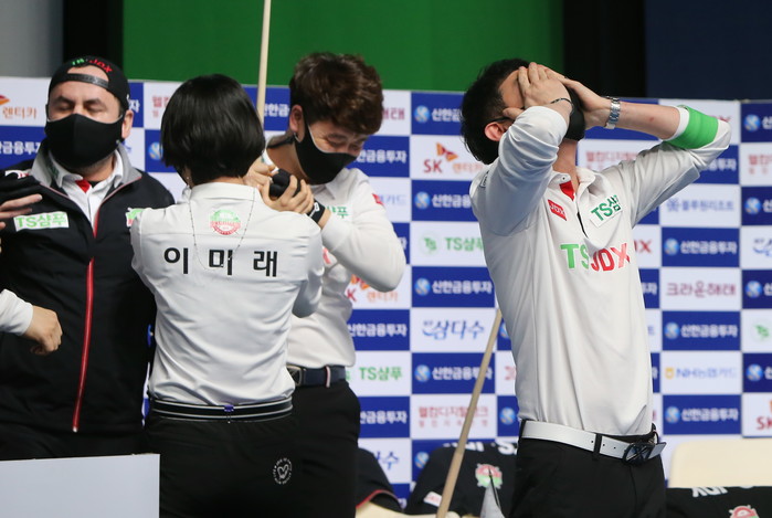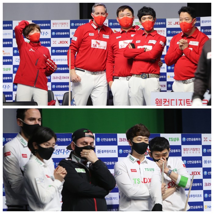 ▲승부치기 마지막 샷을 준비하는 김보미를 지켜보며 두손을 모아 기도하는 SK렌터카 강동궁주장(상) 마지막 샷을 가슴 졸이며 지켜보는 TS.JDX 정경섭주장 |
