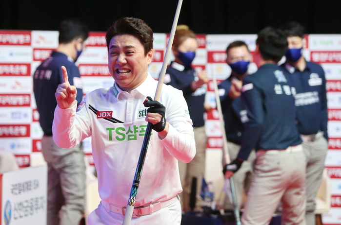 4이닝 10점의 하이런을 몰아치며 한세트를 가져온 TS샴프의 주장 김종원이 동료들의 축하에 춤으로 응답하고 있다[Brilliant Billiards=김철호 기자]