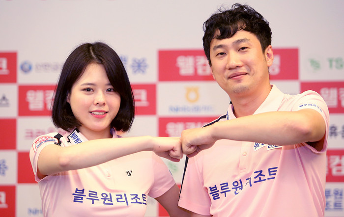 블루원리조트의 새로운 혼합복식조 홍진표-서한솔조가 승리를 거두며 블루원리조트의 9경기 무승에서 탈출시켰다. 주먹을 마주하며 화이팅하는 서한솔-홍진표조<PBA 사무국>